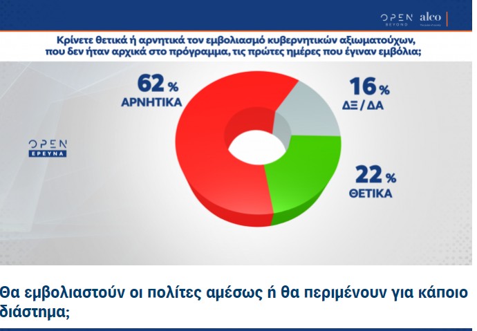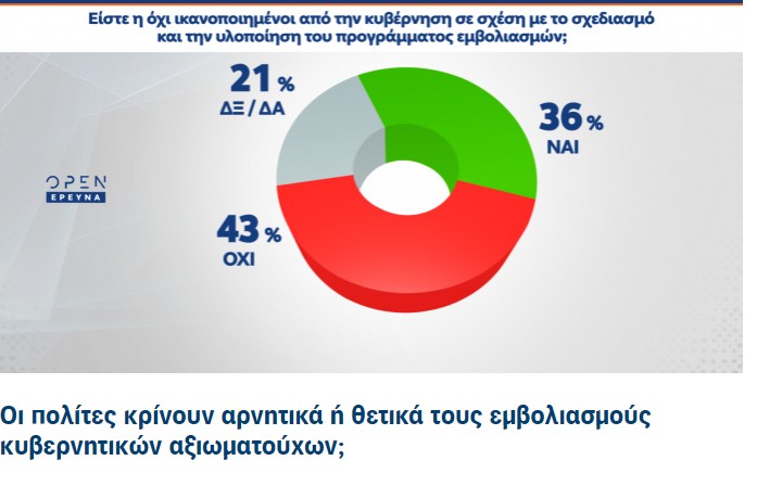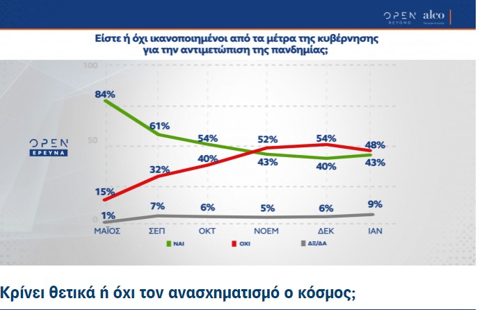 Σύμφωνα με τη δημοσκόπηση για λογαριασμό του Open, το 48% των πολιτών δηλώνουν μη ικανοποιημένο από τα μέτρα της κυβέρνησης Μητσοτάκη για την αντιμετώπιση της πανδημίας του κοροναϊού, έναντι 43%, που δηλώνουν ικανοποίηση.