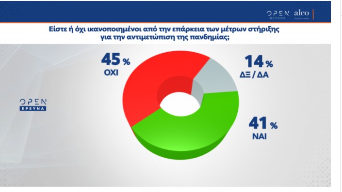 Το 45% θεωρεί ανεπαρκή τα μέτρα στήριξης έναντι των οικονομικών επιπτώσεων της πανδημίας, έναντι 41% που τα θεωρεί επαρκή.