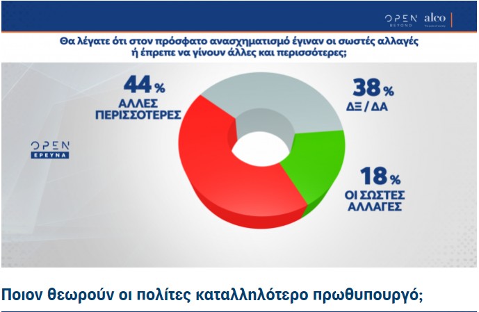 Το 44% των πολιτών κρίνουν ότι στον πρόσφατο ανασχηματισμό έπρεπε να γίνουν άλλες και περισσότερες αλλαγές, ενώ το 18% κρίνει ότι αυτές που έγιναν ήταν οι σωστές.