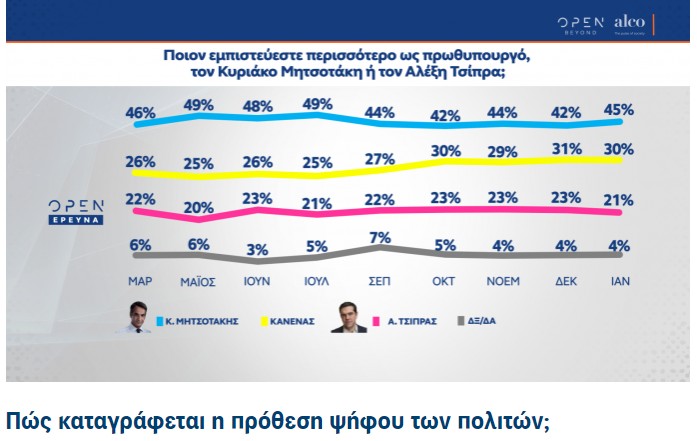 Ισχυρό είναι και το προβάδισμα του πρωθυπουργού και Κυριάκου Μητσοτάκη στην ερώτηση περί καταλληλότερου πρωθυπουργού, με 45%, έναντι 30% που απαντά «κανέναν» και 21% του προέδρου του ΣΥΡΙΖΑ Αλέξη Τσίπρα.