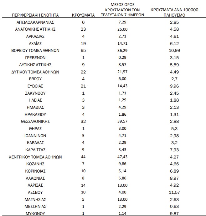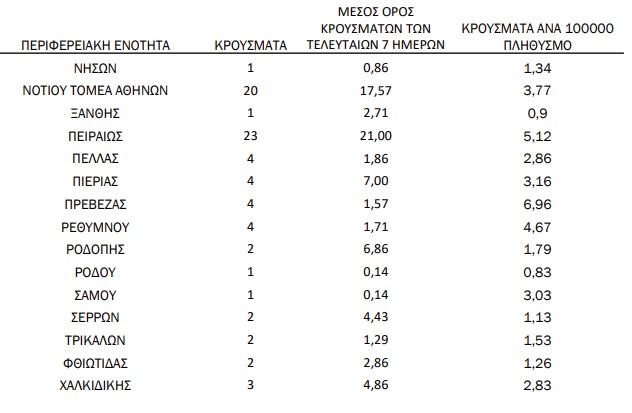 Δυτική Αττική και νησιά του Αργοσαρωνικού καταγράφουν μονοψήφιο αριθμό κρουσμάτων με 9 και 1 αντίστοιχα.
