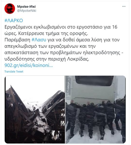 Από το βάρος του χιονιού και σε συνδυασμό με τη χρόνια έλλειψη συντήρησης, κατέρρευσε μεγάλο τμήμα της οροφής του εργοστασίου, στο σημείο όπου βρίσκονται τα καμίνια και από τύχη δεν υπήρξε τραυματισμός εργαζομένων. Η ανησυχία των εργαζομένων ήταν έντονη καθώς φοβήθηκαν να παραμείνουν στους στεγασμένους χώρους, ενώ παράλληλα ιδιαίτερα μεγάλη είναι η ταλαιπωρία καθώς βρίσκονται στο εργοστάσιο κάτω από αντίξοες συνθήκες 16 ολόκληρες ώρες. Σημειώνεται πως χθες ο οικισμός της ΛΑΡΚΟ ήταν χωρίς ηλεκτροδότηση και νερό. Επίσης χωρίς ηλεκτρικό ρεύμα ήταν η Λάρυμνα, το Μαρτίνο και η Μαλεσίνα.
