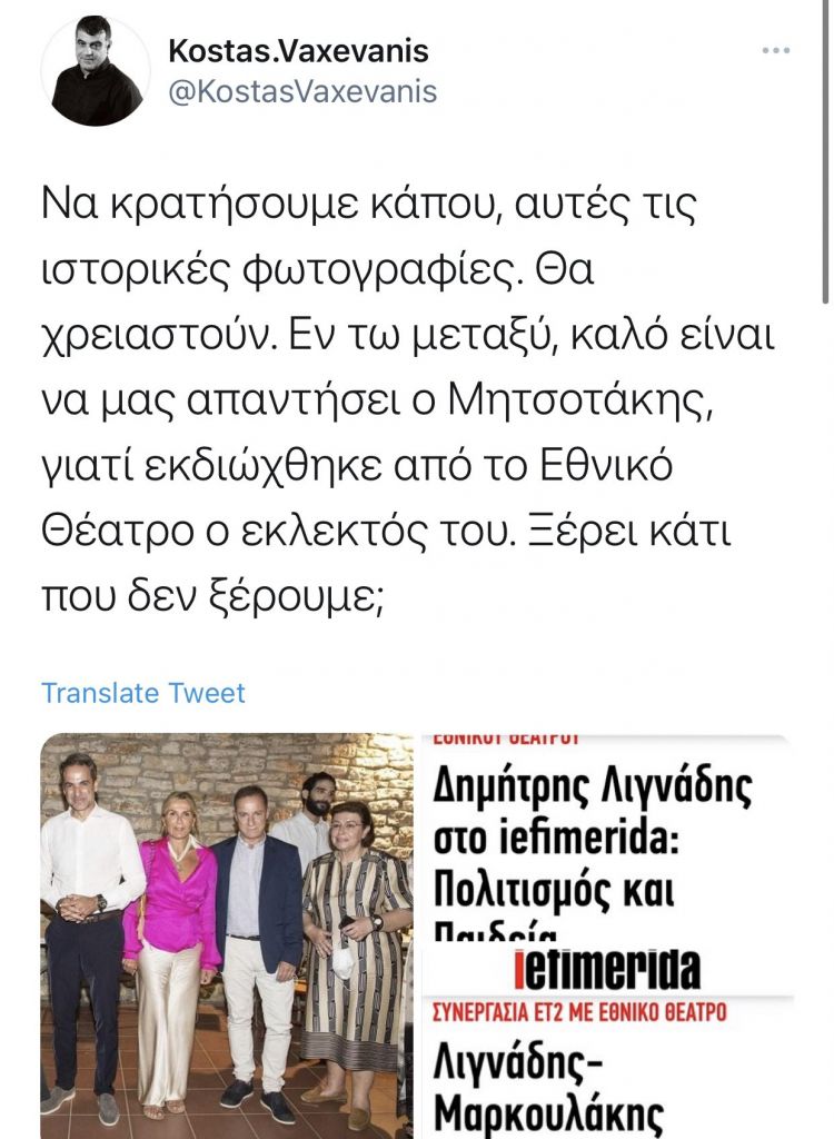 Την ίδια «κομμένη» φωτογραφία χρησιμοποίησε και ο Κώστας Βαξεβάνης στις επιθέσεις, μέσω social media, στον πρωθυπουργό για τον Λιγνάδη. Την αποκάλεσε, μάλιστα, «ιστορική», αλλά ξεχνώντας να επισημάνει ότι λείπει η πρώην υπουργός του ΣΥΡΙΖΑ Λυδία Κονιόρδου.