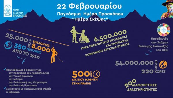 Πολύ σημαντική είναι η σημερινή ημέρα, αν και πολλοί αγνοούν τι… γιορτάζουμε. Κι όμως, στις 22 Φεβρουαρίου, κάθε χρόνο γιορτάζει η μεγαλύτερη εθελοντική παιδαγωγική κίνηση για νέους σε όλο τον κόσμο: η Προσκοπική Κίνηση! Περισσότερα από 54.000.000 μέλη σε 220 χώρες σε όλο τον κόσμο γιορτάζουν την ημέρα γέννησης του Ιδρυτή της Προσκοπική Κίνησης, Λόρδου Baden-Powell.