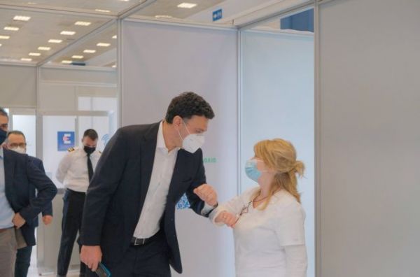 Ο υπουργός περιηγήθηκε στους χώρους και συνομίλησε με τo υγειονομικό προσωπικό και τους πολίτες που εμβολιάζονταν.