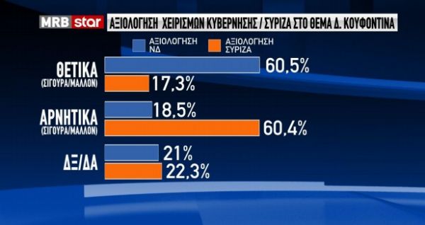 Διατήρηση της ψαλίδας υπέρ της ΝΔ, με διαφορά 13,1% από τον ΣΥΡΙΖΑ, καταγράφεται σε νέα δημοσκόπηση της MRB, για λογαριασμό του κεντρικού δελτίου ειδήσεων του Star. Παράλληλα, οι πολίτες απαντούν και στα «καυτά» θέματα της επικαιρότητας, κρίνοντας τους κυβερνητικούς χειρισμούς, αλλά και αυτούς της αξιωματικής αντιπολίτευσης, τόσο στην υπόθεση του κρατούμενου απεργού πείνας Δημήτρη Κουφοντίνα, όσο και σε αυτήν του κατηγορούμενου για βιασμούς κατά συρροή, Δημήτρη Λιγνάδη.