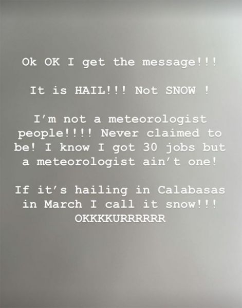 Γρήγορα, οι θαυμαστές της την ενημέρωσαν ότι τα λευκά πράγματα που έβλεπε, δεν ήταν χιόνι αλλά χαλάζι. Η Κιμ αντέδρασε σε αυτό γράφοντας στο story της στο Instagram: «Εντάξει, εντάξει το πήρα το μήνυμα!! Είναι ΧΑΛΑΖΙ!!! Όχι ΧΙΟΝΙ!»