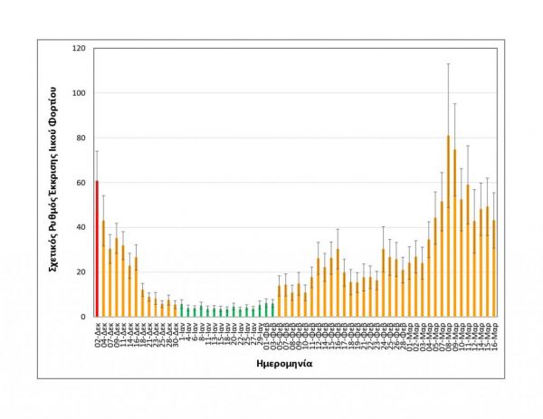 Συγκεκριμένα, σύμφωνα με την εξέλιξη των μετρήσεων από δείγματα που λαμβάνονται καθημερινά στην είσοδο της Εγκατάστασης Επεξεργασίας Λυμάτων Θεσσαλονίκης, αναφορικά με τις εξορθολογισμένες τιμές σχετικής έκκρισης ιικού φορτίου:
