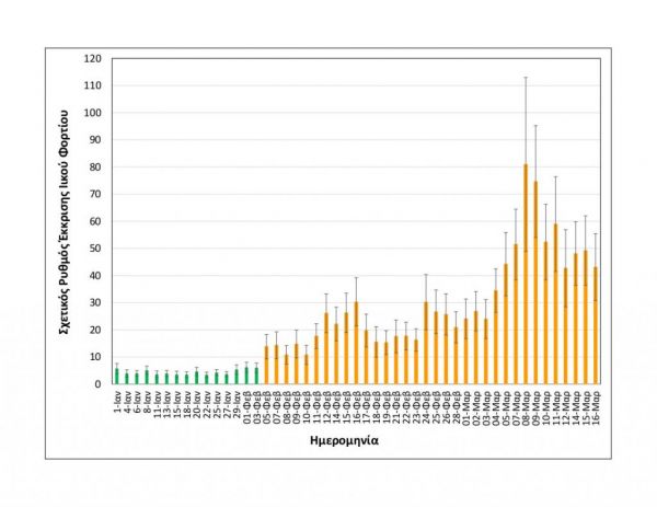 -Σταθερή (αύξηση μόλις 2%) σε σχέση με τη μέση τιμή των δύο αμέσως προηγούμενων μετρήσεων, δηλαδή της Παρασκευής 12/3 και της Κυριακής 14/3.