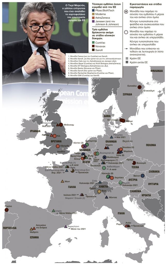 Σε αυτό το πλαίσιο, μέσα στους δύο τελευταίους μήνες ο Μπρετόν έχει επισκεφθεί κάθε γωνιά της Γηραιάς Ηπείρου – Βέλγιο, Ελβετία, Ιταλία, Αυστρία, Ουγγαρία, Δανία, Λετονία, Εσθονία, Ισπανία και Πορτογαλία – με σκοπό να πραγματοποιήσει αυτοψίες στις υπάρχουσες μονάδες και να αξιολογήσει κατά πόσο (και υπό ποιες προϋποθέσεις) μπορούν να ενταχθούν στο σχέδιό του και να το εξυπηρετήσουν. Οι πληροφορίες της γαλλικής εφημερίδας αναφέρουν, μάλιστα, ότι μέχρι στιγμής έχουν μπει στη σχετική λίστα 53 μικρές, μεσαίες και μεγάλες βιομηχανικές μονάδες και έχει τεθεί στόχος, μέχρι το τέλος του 2021, να είναι σε θέση να παράγουν 2-3 δισεκατομμύρια δόσεις ετησίως – αριθμός θεωρητικά υπερεπαρκής για να καλύψει τις ανάγκες των 450 εκατομμυρίων πολιτών της ΕΕ.
