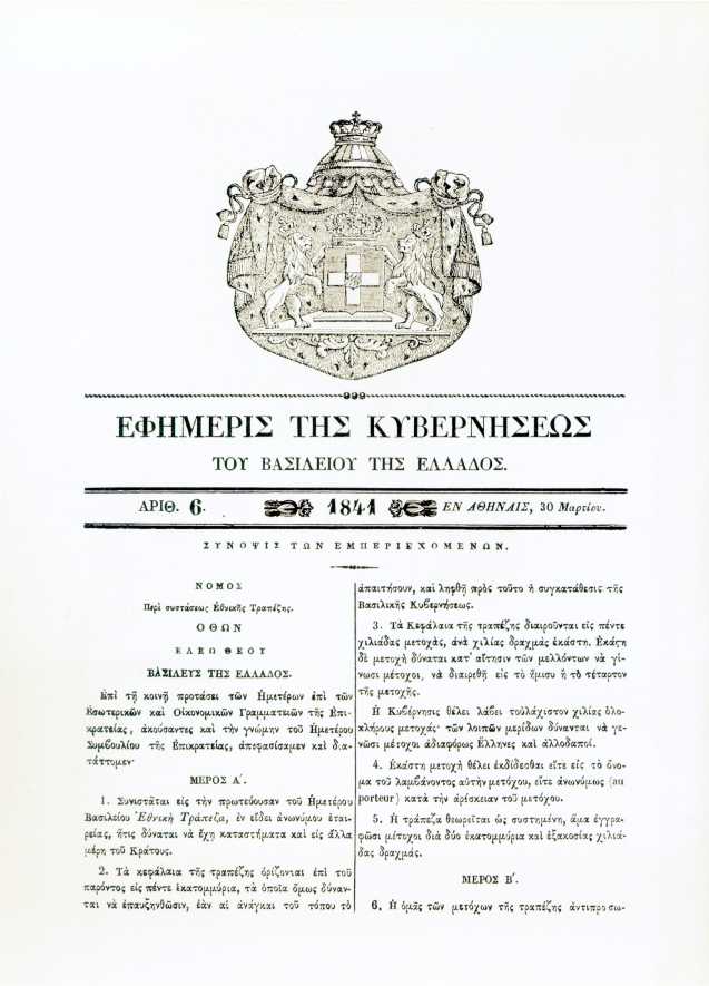 Όλα ξεκίνησαν στις 30 Μαρτίου του 1841, όταν ένα διάταγμα του Όθωνα Α’ έδωσε το πράσινο φως για την ίδρυση του πρώτου χρηματοπιστωτικού ιδρύματος της χώρας. Το όνομα αυτού: Εθνική Τράπεζα. Μέσα από τη λειτουργία της εισήχθη για πρώτη φορά ο θεσμός της τραπεζικής πίστης στο νεοσύστατο κράτος και εκδόθηκαν τα πρώτα χαρτονομίσματα – μια αρμοδιότητα που η Εθνική διατήρησε μέχρι και την ίδρυση της Τράπεζας της Ελλάδας το 1928.