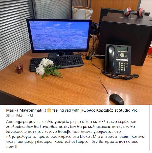 Η Μαρίκα Μαυρομάτη μοιραζόταν το ίδιο γραφείο με τον αδικοχαμένο δημοσιογράφο και «ραγίζει καρδιές» το μήνυμά της κάτω από τη φωτογραφία με το άδειο γραφείο που δημοσίευσε στο Facebook.