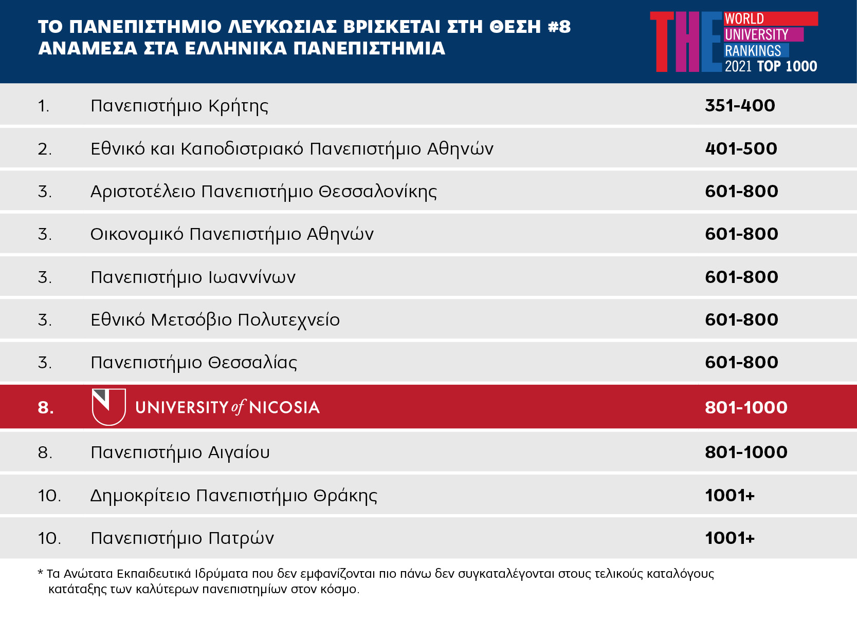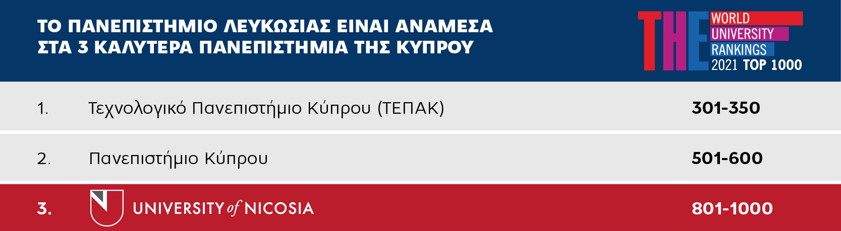 Στα 801-1000 καλύτερα πανεπιστήμια παγκοσμίως, μαζί με μόλις 8 άλλα πανεπιστήμια της Ελλάδας, κατετάγη το Πανεπιστήμιο Λευκωσίας από το Times Higher Education (THE) World University Rankings 2021. Σημειώνεται ότι η εν λόγω κατάταξη αντιπροσωπεύει τη μεγαλύτερη και από τις πιο έγκυρες κατατάξεις πανεπιστημίων στον κόσμο. Η κατάταξη αυτή ουσιαστικά τοποθετεί το Πανεπιστήμιο Λευκωσίας ανάμεσα στο 4% των καλύτερων πανεπιστημίων παγκοσμίως και αποτελεί επικύρωση της υψηλής ποιότητάς του και της εκπαίδευσης που προσφέρει.