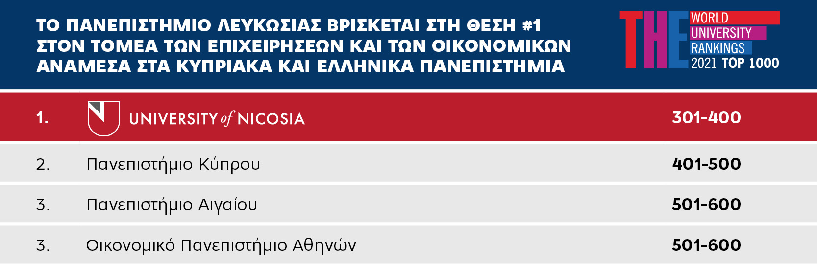 Επιπλέον, τα τελευταία αποτελέσματα της ετήσιας κατάταξης Times Higher Education (THE) World University Rankings by Subject, κατατάσσουν το Πανεπιστήμιο Λευκωσίας μεταξύ των 301-400 καλύτερων πανεπιστημίων στον κόσμο, στον τομέα των Επιχειρήσεων και των Οικονομικών. Αυτή η κατάταξη το τοποθετεί ως το #1 πανεπιστήμιο σε Κύπρο και Ελλάδα και ανάμεσα στα κορυφαία 100 στην Ευρωπαϊκή Ένωση, στον εν λόγω τομέα.