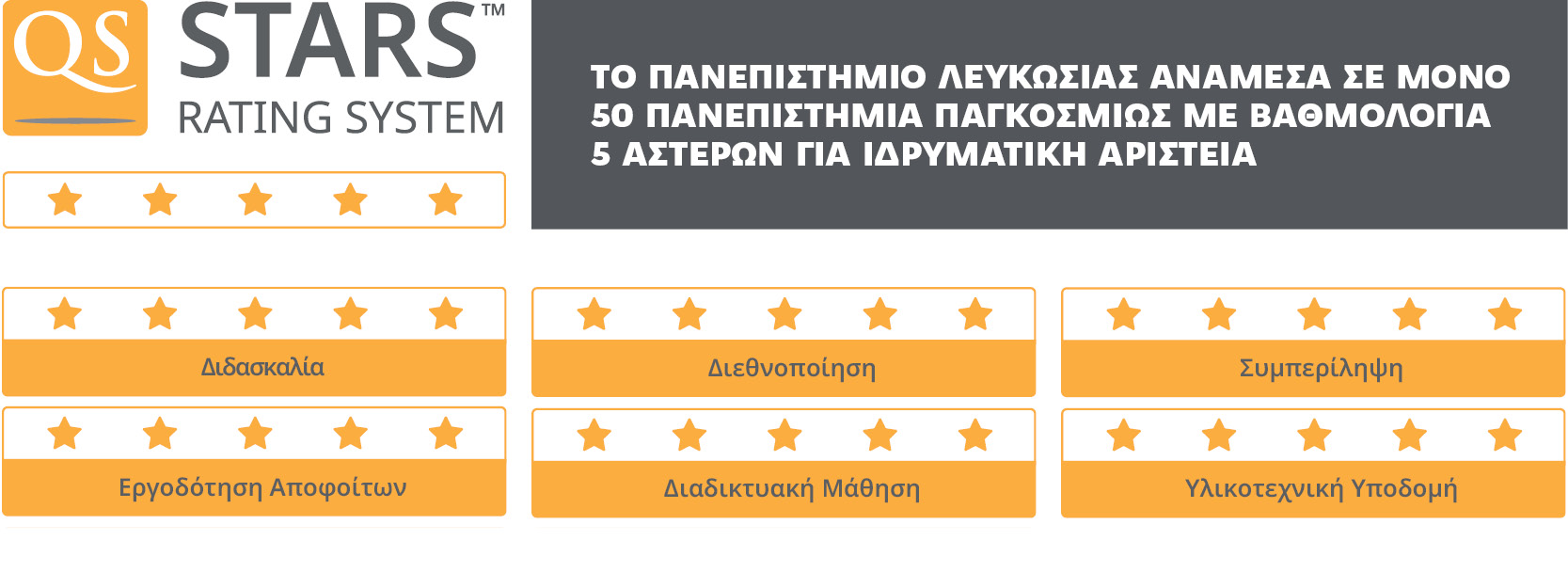 Το Πανεπιστήμιο βαθμολογείται επίσης με 5 QS Stars για Ιδρυματική Αριστεία, ως μέρος της αξιολόγησης του QS Stars University Ratings System 2020. Αυτό αποτελεί αναγνώριση τις υποδειγματικής απόδοσής του, καθιστώντας το έτσι ως το πρώτο πανεπιστήμιο σε Κύπρο και Ελλάδα που επιτυγχάνει την εξαίρετη αυτή βαθμολογία, μαζί με μόνο άλλα 50 πανεπιστήμια ανά τον κόσμο. Πέρα από την υποδειγματική συνολική απόδοσή του, το Πανεπιστήμιο έλαβε την ύψιστη βαθμολογία (5 Αστέρων) στους σημαντικότατους τομείς της διδασκαλίας, της εργοδότησης των αποφοίτων, της διεθνοποίησης, της διαδικτυακής μάθησης/εξ αποστάσεως εκπαίδευσης, της συμπερίληψης και της υλικοτεχνικής υποδομής.