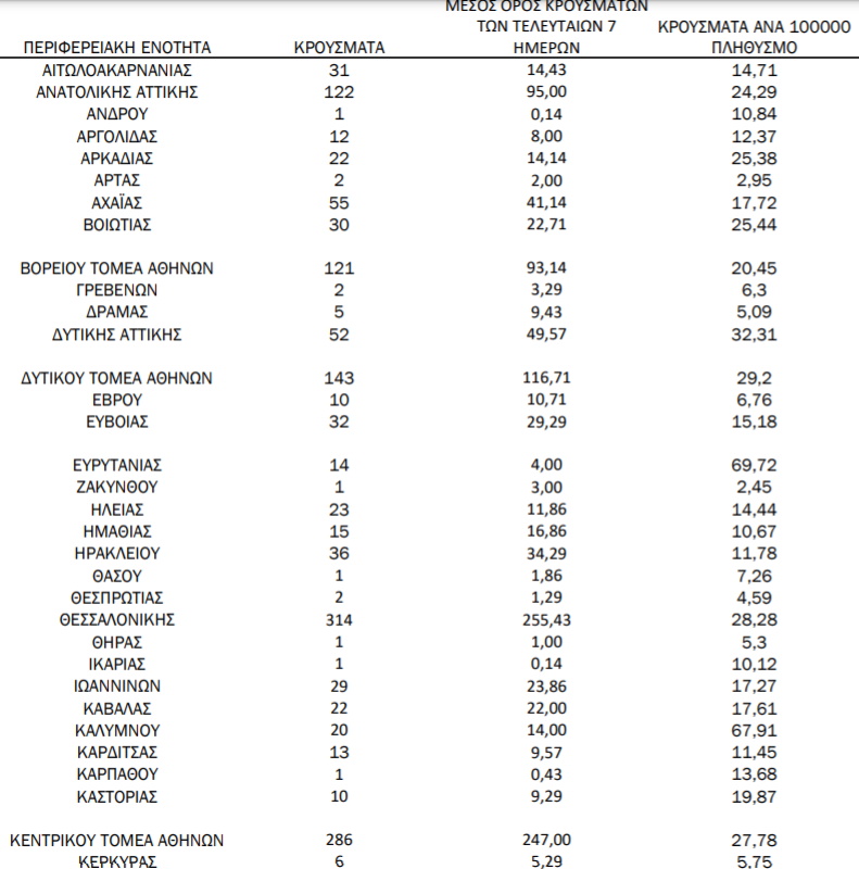 Τέλος, Δυτική Αττική και νησιά του Αργοσαρωνικού καταγράφουν 52 και 6 κρούσματα αντίστοιχα.