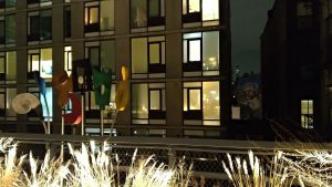 Το ντιζαϊνάτο, δεκαοκταόροφο ξενοδοχείο Standard και το ιστορικό, επίσης δεκαοκταόροφο, συγκρότημα London Terrace «φύονται» εκατέρωθεν της γέφυρας αλλά σε κάποια απόσταση. Από άλλα κτίρια όμως περνάς ξυστά! Όσο διακριτικός κι αν προσπαθείς να είσαι, είναι αδύνατον να μην πέσει το μάτι σου πάνω στους ενοίκους που κάνουν τη βραδυνή τους γυμναστική ή μαγειρεύουν ή περιμένουν να τελειώσει η πλύση τους στο πλυντήριο/στεγνωτήριο της πολυκατοικίας. Δεν είμαστε εμείς ηδονοβλεψίες –αυτοί είναι επιδειξίες, αφού έχουν τις κουρτίνες τραβηγμένες (για την ακρίβεια, κάποιοι δεν έχουν καν κουρτίνες), και αφού διαμερίσματα και λόμπυ είναι εξίσου αριστοτεχνικά φωτισμένα με τη βλάστηση επί της «Υψηλής Γραμμής.» Οι ένοικοι πληρώνουν ολόκληρες περιουσίες για να μείνουν εδώ –άρα μάλλον θέλουν να τους βλέπουμε… (Δεν πρόσεξα κανέναν να κοιτάζει προς τα έξω, εκτός από μια γάτα που κάθεται μεγαλόπρεπα στο παράθυρο και χαζεύει τους λιγοστούς διαβάτες επί της πασαρέλας.)