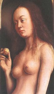 Για να τη διαπιστώσει κάποιος θα πρέπει να δει ανοιχτό το περίφημο πολύπτυχο με τις 24 παραστάσεις που βρίσκεται στον καθεδρικό της βελγικής πόλης κι εδώ και δύο μήνες φυλάσσεται σε ειδική, αλεξίσφαιρη προθήκη κόστους 30 εκατ. ευρώ, επειδή στο παρελθόν λεηλατήθηκε, μέρη του πωλήθηκαν και λίγο έλειψε να γίνει παρανάλωμα. Ο θεατής θα πρέπει να στρέψει το βλέμμα του στη γυμνή μορφή πάνω δεξιά, στην Εύα, και να παρατηρήσει τι κρατά στο ανασηκωμένο δεξί της χέρι. Το ύφος της μαρτυρά το μέλλον που την περιμένει, η προτεταμένη κοιλιά της αποκαλύπτει ότι θα είναι εκείνη που θα επωμιστεί τον ρόλο της μητέρας του ανθρώπινου γένους. Παρ’ όλ’ αυτά, ακόμη δεν έχει αμαρτήσει. Ως σημείο καμπής δεν θεωρείται η στιγμή που λαχτάρησε το απαγορευμένο φρούτο, ούτε εκείνη που το απέκτησε.