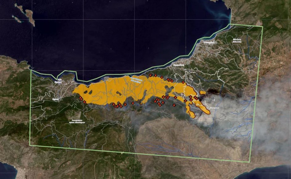Τις περιοχές που έχουν ήδη καεί, τα ενεργά μέτωπα αλλά και την δυνητικά απειλούμενη περιοχή από την πυρκαγιά της Κορινθίας καταγράφει το ευρωπαϊκό δορυφορικό σύστημα «Κοπέρνικος».