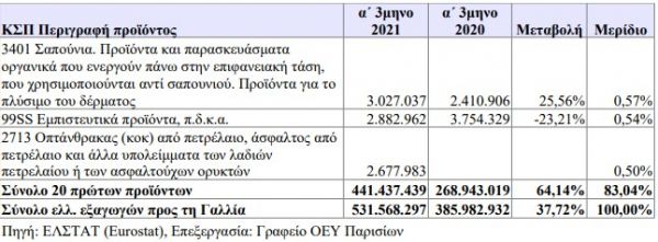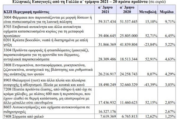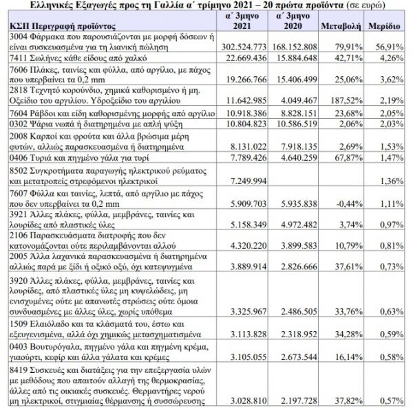 Η θεαματική αύξηση των ελληνικών εξαγωγών προς τη Γαλλία κατά το α΄ τρίμηνο του 2021 οφείλεται ουσιαστικά στην αύξηση της αξίας των εξαγωγών των συσκευασμένων φαρμάκων, η οποία έφτασε τα 302 εκατ. ευρώ, συνεχίζοντας την ανοδική της πορεία με αύξηση 80% σε σχέση με το α΄ τρίμηνο 2020, καταλαμβάνοντας σε μερίδιο περισσότερο από το ήμισυ των συνολικών εξαγωγών της χώρας μας προς τη Γαλλία (57%).