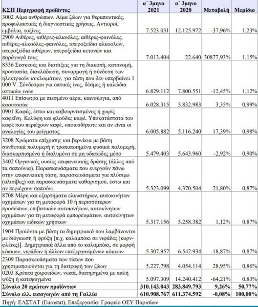 Από την πλευρά των εισαγόμενων προϊόντων από τη Γαλλία, την 1η θέση καταλαμβάνουν τα φάρμακα με μερίδιο 10% και αξία 157 εκατ. ευρώ. Ακολουθούν τα επιβατικά αυτοκίνητα, τα οποία κατέγραψαν σημαντική αύξηση 53% και διαμορφώθηκαν σε 39 εκατ. ευρώ (μερίδιο 6,5%), τα νωπά κρέατα βοοειδών που μειώθηκαν επίσης εντυπωσιακά κατά 24% και διαμορφώθηκαν σε αξία σε 32 εκατ. ευρώ και τα προϊόντα ομορφιάς ή μακιγιάζ με μερίδιο 4,6% και αξία 28 εκατ. ευρώ, έχοντας αυξηθεί κατά 53%.