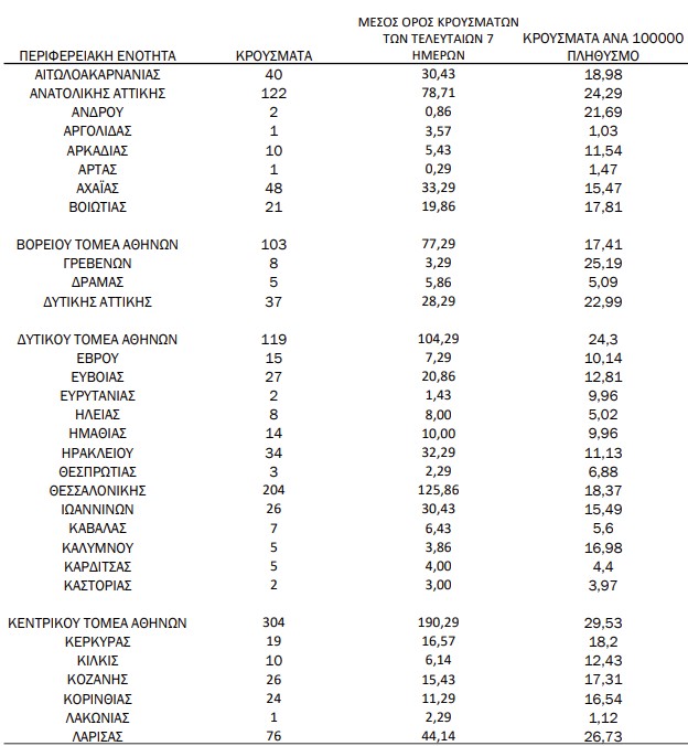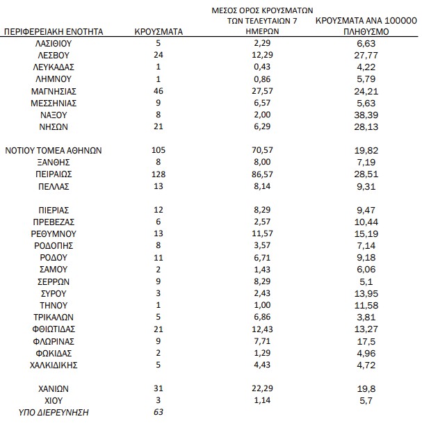 Τέλος, Δυτική Αττική και νησιά του Αργοσαρωνικού καταγράφουν 37 και 21 κρούσματα αντίστοιχα.