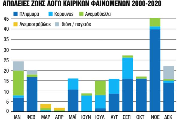 Περισσότεροι από 11 άνθρωποι τον χρόνο πέθαιναν στην Ελλάδα την τελευταία 20ετία εξαιτίας ακραίων καιρικών φαινομένων. Σύμφωνα με στοιχεία του Εθνικού Αστεροσκοπείου Αθηνών, την περίοδο 2000-2020 η χώρα μας χτυπήθηκε από 488 καιρικά επεισόδια που είχαν σοβαρές κοινωνικές και οικονομικές επιπτώσεις, με το ένα τρίτο εξ αυτών να προκαλεί εκτεταμένες καταστροφές σε μία ή περισσότερες περιοχές της Ελλάδας. Οι πλημμύρες αναδεικνύονται στο πιο συχνό καταστροφικό φαινόμενο και η Αττική πρώτη στη λίστα των απωλειών, ενώ το πιο πολύνεκρο επεισόδιο ήταν η πλημμύρα στη Μάνδρα τον Νοέμβριο του 2017, με 24 ανθρώπινες απώλειες.