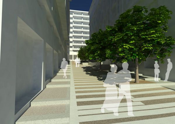 Προτείνεται η δημιουργία ενός κεντρικού πλατώματος μπροστά από την Διπλάρειο Σχολή, σε χαμηλότερη στάθμη από το γύρω περιβάλλον, το οποίο θα λειτουργεί ώς συλλογικό καθιστικό. Στο εσωτερικό του πλατώματος, η παρουσία μιας μεγάλης ελιάς στο κέντρο, σε συνδυασμό με ένα κανάλι ανακυκλούμενου νερού, θα λειτουργούν ως μια φυσική εγκατάσταση τέχνης, υπαινικτική της Αθηναϊκής μυθολογίας που εδραιώνει την σχέση της πόλης και της «εξοχής».