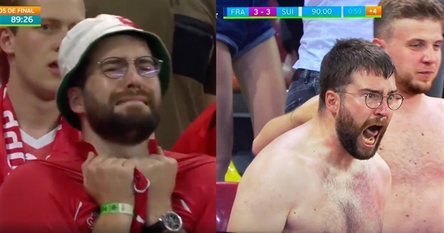 Τις δύο φωτογραφίες τις χωρίζουν 2.547 ημέρες και 9.914 χιλιόμετρα. Στην πρώτη που τραβήχτηκε κατά τη διάρκεια της συντριβής της Βραζιλίας από τη Γερμανία με 7-1 στα ημιτελικά του Παγκοσμίου Κυπέλλου του 2014, στο Μπέλο Οριζόντε, ο οπαδός της Σελεσάο κομματιάζει τη σημαία της Βραζιλίας με τα δόντια του λόγω του μεγάλου θυμού του για το αποτέλεσμα. Στη δεύτερη, που τραβήχτηκε στις 28 Ιουνίου στην Αρένα του Βουκουρεστίου ενός ελβετός οπαδός έχει ξεγυμνωθεί από τη μέση και πάνω και ουρλιάζει από χαρά για την ισοφάριση της Ελβετίας σε 3-3 στο παιχνίδι με τη Γαλλία. Πέντε λεπτά νωρίτερα ο ίδιος οπαδός ήταν ντυμένος και έκλαιγε για την ατυχία της ομάδας του.