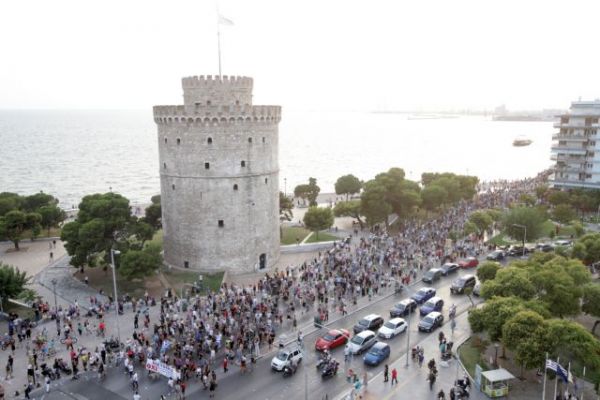 Εκατοντάδες άτομα συγκεντρώθηκαν στον Λευκό Πύργο αντιδρώντας στον εμβολιασμό και στα περιοριστικά μέτρα, ενώ κρατούσα ελληνικές σημαίες, και φώναζαν συνθήματα όπως «δεν θα περάσει ο φασισμός», «κάτω η χούντα του Μητσοτάκη». Οι συμετέχοντες τραγούδησαν πολλές φορές το «Μακεδονία ξακουστή», ενώ σε ένα από τα πανό έγραφαν: «Ελευθερία. Οχι στους διαχωρισμούς, στους εκβιασμούς, στην τρομοκρατία».