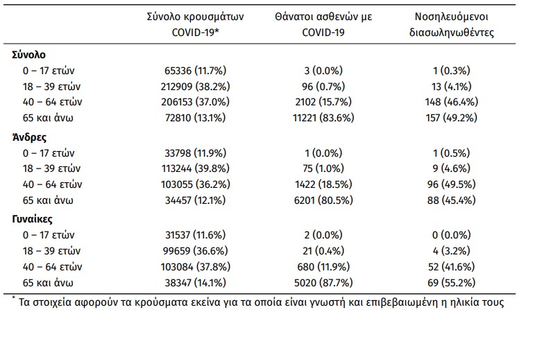 Οι νέοι θάνατοι ασθενών με COVID-19 είναι 34, ενώ από την έναρξη της επιδημίας έχουν καταγραφεί συνολικά 13.422 θάνατοι. Το 95.3% είχε υποκείμενο νόσημα ή/και ηλικία 70 ετών και άνω.