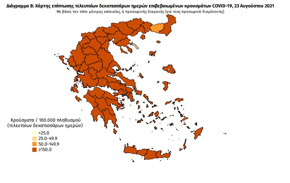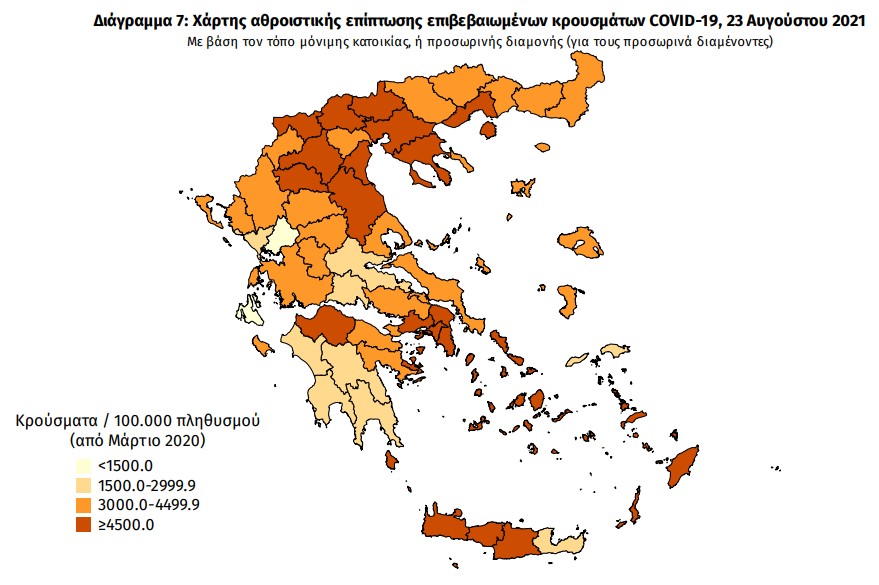 Ο χάρτης αποτυπώνει τη γεωγραφική κατανομή των συνολικών κρουσμάτων COVID-19 (από την αρχή της επιδημίας) ανά Περιφερειακή Ενότητα της χώρας, με βάση την δηλωθείσα διεύθυνση μόνιμης κατοικίας του ασθενούς, ή τη διεύθυνση προσωρινής διαμονής για τους τουρίστες και άλλους προσωρινά διαμένοντες στην Ελλάδα. Συμπεριλαμβάνονται τόσο κρούσματα με ιστορικό ταξιδίου (“εισαγόμενα”) όσο και κρούσματα με πιθανή εγχώρια μετάδοση.