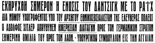 «Η αγάπη μου προς την ειρήνη εξελήφθη προφανώς ως αδυναμία ή ακόμη ως δειλία. (…) Απεφάσισα λοιπόν να χρησιμοποιήσω έναντι της Πολωνίας την ίδιαν γλώσσαν την οποίαν χρησιμοποιεί και αυτή. Εάν η απόφασίς μου αυτή θίγη, κατά την άποψιν των Δυτικών Δυνάμεων, τα συμφέροντά των, λουπούμαι πολύ δι’ αυτό, αλλά δεν θα με κάμη να διστάσω ουδε εν δευτερόλεπτον. (…)
