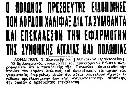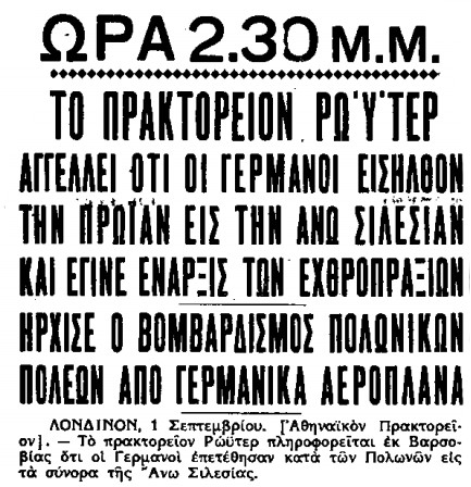 «ΑΘΗΝΑΪΚΑ ΝΕΑ», 1.9.1939, Ιστορικό Αρχείο «ΤΟ ΒΗΜΑ» & «ΤΑ ΝΕΑ»