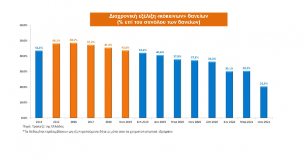 Στα 29,4 δισ. ευρώ (20,3% του συνόλου των δανείων) διαμορφώθηκαν τα μη εξυπηρετούμενα δάνεια των ελληνικών τραπεζών τον Ιούνιο του 2021, σύμφωνα με τα στοιχεία της Τράπεζας της Ελλάδος, με τον υπουργό Οικονομικών Χρήστο Σταϊκούρα να επισημαίνει ότι έχουν υποχωρήσει κατά περίπου 46 δισ. ευρώ από τότε που η Νέα Δημοκρατία ανέλαβε τη διακυβέρνηση της χώρας (ήταν 75,3 δισ. ευρώ τον Ιούνιο του 2019) και κατά περίπου 78 δισ. ευρώ από το υψηλότερο σημείο που είχαν φτάσει, τον Μάρτιο του 2016 (ήταν 107,2 δισ. ευρώ).