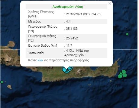 Εντονη σεισμική δραστηριότητα καταγράφεται από νωρίς σήμερα το πρωί στο Ηράκλειο της Κρήτης. Λίγη ώρα μετά τον πρωινό σεισμό των 4,5 Ρίχτερ σημειώθηκε και νέα δόνηση 4,4 Ρίχτερ με επίκεντρο το Αρκαλοχώρι.