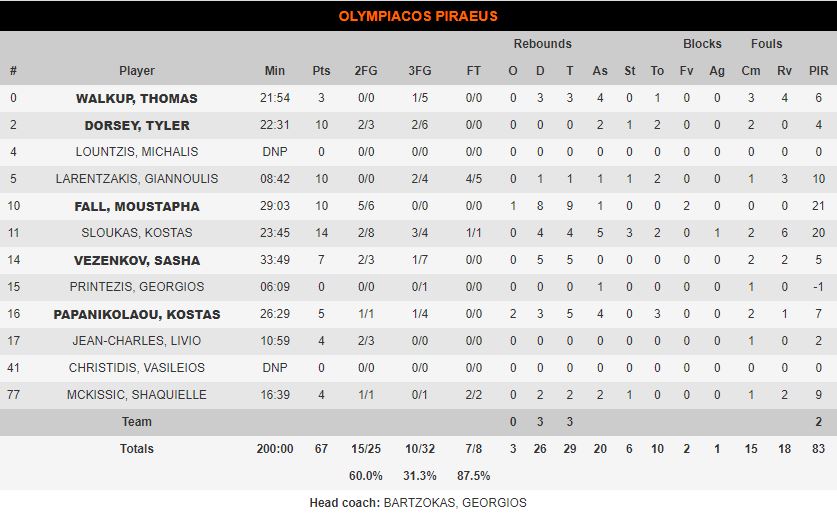 Ο Σλούκας τελείωσε τον αγώνα με 14 πόντους (2/8 δίποντα, 3/4 τρίποντα, 1/1 βολές), 4 ριμπάουντ και 5 ασίστ σε 23΄, όντας ο πρώτος σκόρερ για τον Ολυμπιακό, με τους Ντόρσεϊ και Φαλ να τον ακολουθούν στο σκοράρισμα με 10 πόντους.