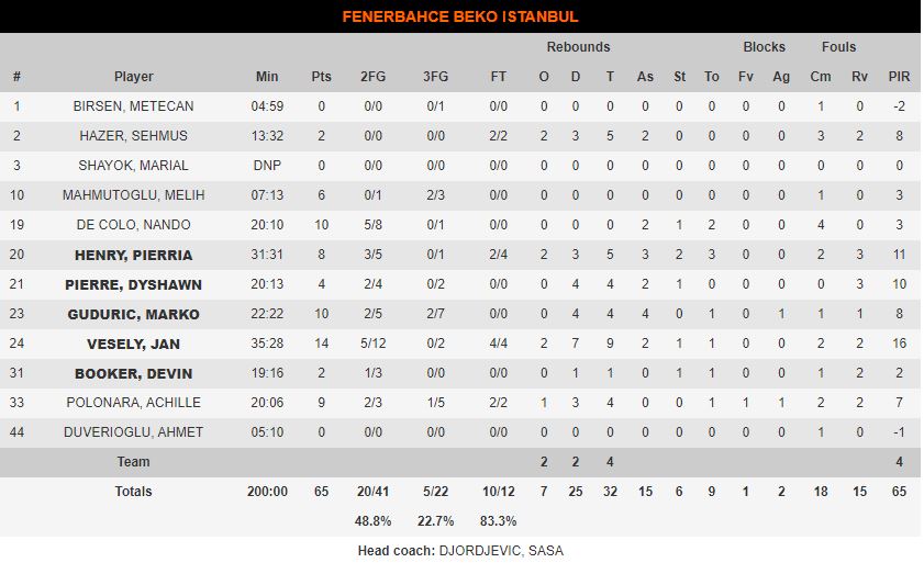 Για τη Φενέρ ξεχώρισε ο Βέσελι με 14 πόντους (5/12 δίποντα, 0/2 τρίποντα, 4/4 βολές) και 9 ριμπάουντ, με τους Γκούντουριτς και Ντε Κολό να τελειώνουν με 10.