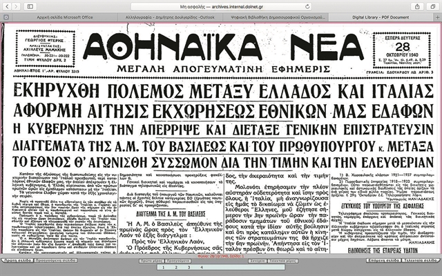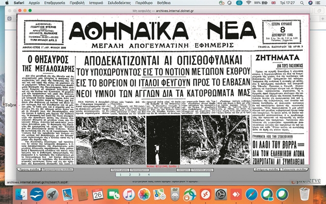 Ολες τις μεγάλες στιγμές ενός τιτάνιου, άνισου αγώνα εναντίον δύο, διαδοχικά, από τους ισχυρότερους στρατούς του τότε κόσμου, μπορεί να τις αισθανθεί κανείς μέσα από τον Τύπο της εποχής. Στις ανταποκρίσεις από το μέτωπο και από τις ξένες πρωτεύουσες, στις άμεσες μαρτυρίες στρατιωτών και αξιωματικών την ώρα που τα γεγονότα συνέβαιναν, στις συνεχείς αναλύσεις των εξελίξεων, στα κείμενα από την αρχή μέχρι το τέλος τους: στις σελιδοποιήσεις, στους τίτλους και τους συγκλονιστικούς υπέρτιτλους. Βλέπει εκεί και έναν άλλον αγώνα: για τη διατήρηση και την ενίσχυση του ηθικού του ελληνικού λαού, όπως δόθηκε ασταμάτητα μέσα από τις σελίδες των «Αθηναϊκών Νέων» και του «Ελεύθερου Βήματος», και άλλων εφημερίδων, που εκτός από το ραδιόφωνο, ήταν η κύρια πηγή ενημέρωσης. Αυτή η στάση των δύο ιστορικών εφημερίδων είναι άλλωστε και ένας από τους λόγους που κατέστησαν ιστορικές. Και επεβίωσαν συνεχίζοντας ακμαίες ήδη επί έναν αιώνα η μία και εννέα δεκαετίες η άλλη. Ακριβώς για τη στάση τους σε σειρά από καταιγιστικές ώρες της Ιστορίας, όπως αυτές.