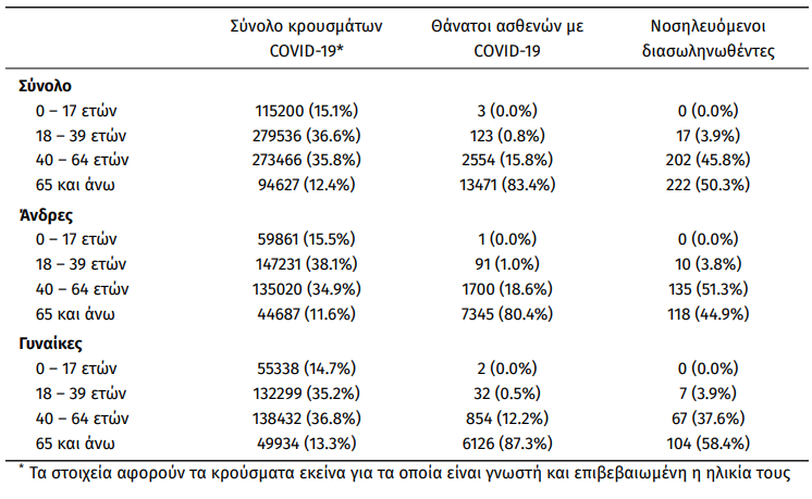 Οι νέοι θάνατοι ασθενών με COVID-19 είναι 42, ενώ από την έναρξη της επιδημίας έχουν καταγραφεί συνολικά 16.151 θάνατοι. Το 95.4% είχε υποκείμενο νόσημα ή/και ηλικία 70 ετών και άνω.