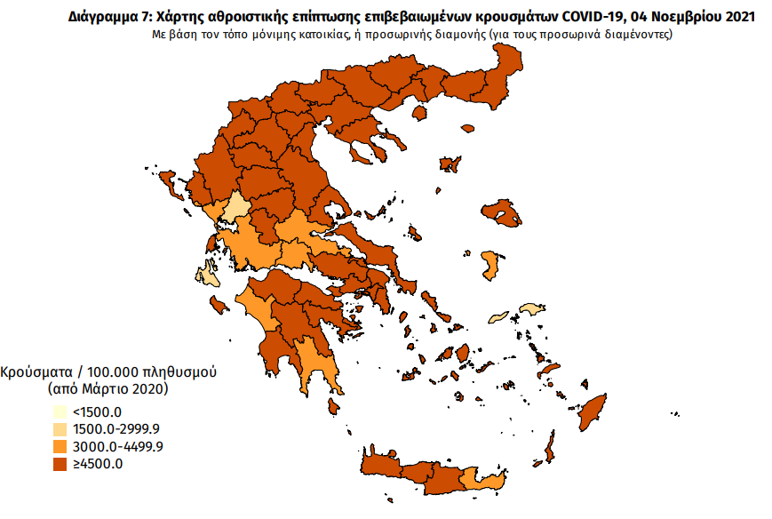 Ο χάρτης αποτυπώνει τη γεωγραφική κατανομή των συνολικών κρουσμάτων COVID-19 (από την αρχή της επιδημίας) ανά Περιφερειακή Ενότητα της χώρας, με βάση την δηλωθείσα διεύθυνση μόνιμης κατοικίας του ασθενούς, ή τη διεύθυνση προσωρινής διαμονής για τους τουρίστες και άλλους προσωρινά διαμένοντες στην Ελλάδα. Συμπεριλαμβάνονται τόσο κρούσματα με ιστορικό ταξιδίου («εισαγόμενα») όσο και κρούσματα με πιθανή εγχώρια μετάδοση.