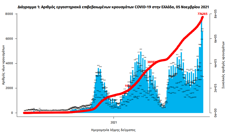 Τα νέα εργαστηριακά επιβεβαιωμένα κρούσματα του κοροναϊού που καταγράφηκαν τις τελευταίες 24 ώρες είναι 6.909 , εκ των οποίων 11 εντοπίστηκαν κατόπιν ελέγχων στις πύλες εισόδου της χώρας. Ο συνολικός αριθμός των κρουσμάτων ανέρχεται σε 774.265 (ημερήσια μεταβολή +0.9%), εκ των οποίων 50.7% άνδρες.