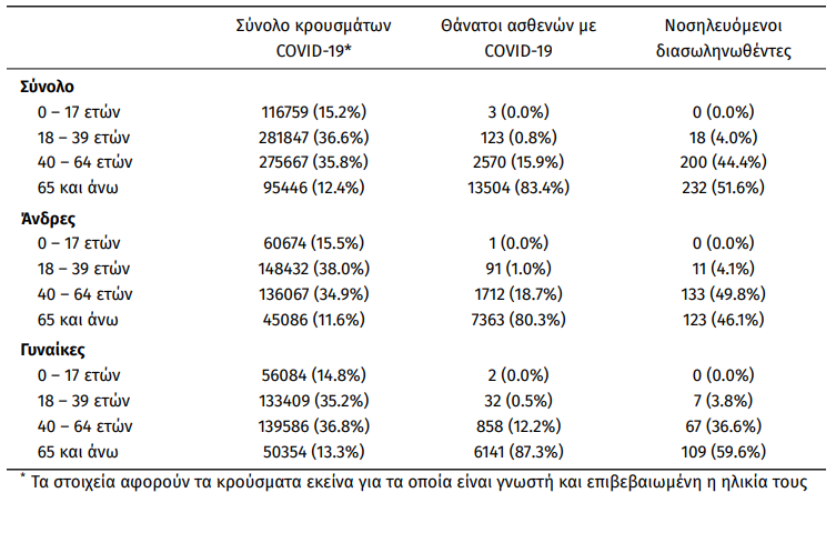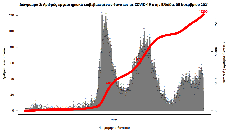 Οι νέοι θάνατοι ασθενών με COVID-19 είναι 48, ενώ από την έναρξη της επιδημίας έχουν καταγραφεί συνολικά 16.200 θάνατοι. Το 95.4% είχε υποκείμενο νόσημα ή/και ηλικία 70 ετών και άνω.