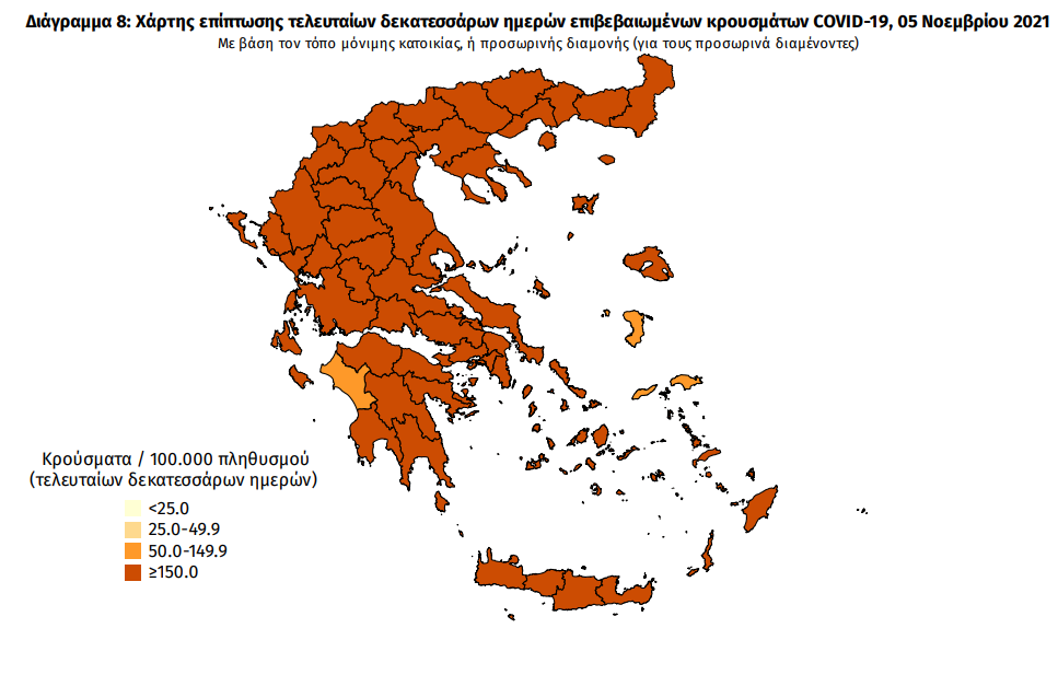 Με βάση τα επιβεβαιωμένα κρούσματα των τελευταίων 7 ημερών, 150 θεωρούνται σχετιζόμενα με ταξίδι από το εξωτερικό και 2.588 είναι σχετιζόμενα με ήδη γνωστό κρούσμα.