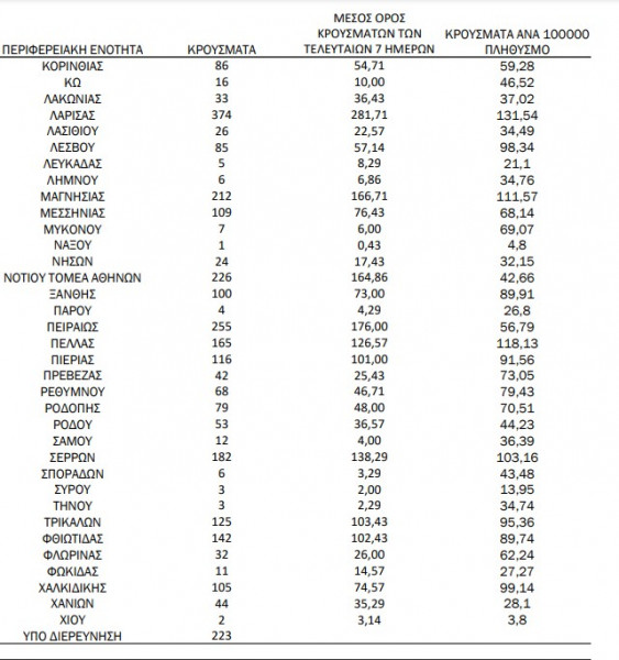 Τέλος, 223 κρούσματα βρίσκονται υπό διερεύνηση.