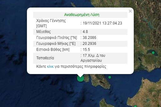 Σεισμός 4,8 Ρίχτερ σημειώθηκε λίγο πριν τις 4 μ.μ. στην Κεφαλονιά. Η σεισμική δόνηση που έγινε αισθητή είχε εστιακό βάθος 15,5 χιλιόμερα.