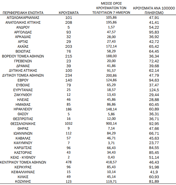 Την ίδια στιγμή, 10 περιοχές καταγράφουν τριψήφιο αριθμό κρουσμάτων.