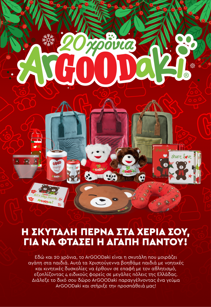Το ArGOODaki των Goody’s Burger House, ο μακροβιότερος θεσμός κοινωνικής προσφοράς στην Ελλάδα, γιορτάζει φέτος 20 χρόνια δράσης και στηρίζει 4 ειδικούς φορείς σε όλη την Ελλάδα. Συγκεκριμένα, υποστηρίζει τους αθλητικούς συλλόγους Α.με.Α. «Ιωνάς» Αθήνας, «Αετοί Θεσσαλονίκης» και «Πύρρος» Ιωαννίνων και τον Μη Κερδοσκοπικό Σωματείο «Κ.Η.Φ.Α.Μ.Ε.Α» Χανίων, προσφέροντας εξοπλισμό για παιδιά και νέους με κινητικές και νοητικές δυσκολίες που ασχολούνται με τον αθλητισμό.