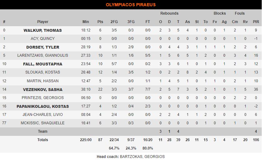 Ήταν ένα καταπληκτικό παιχνίδι, με τρομερές διακυμάνσεις στο σκορ και αλλαγή στην ψυχολογία για τις δύο ομάδες, αλλά ο Ολυμπιακός ήταν πιο ψύχραιμος στην παράταση και κατάφερε να φύγει με ένα σπουδαίο διπλό από το Καζάν. Σπουδαία εμφάνιση από τον Σάσα Βεζένκοφ, ο οποίος είχε 22 πόντους (3/3 δίποντα, 3/7 τρίποντα, 7/7 βολές), 7 ριμπάουντ, 3 ασίστ, 5 κλεψίματα και 36 στο σύστημα αξιολόγησης σε 38:10΄. Εξαιρετικός και ο Γιαννούλης Λαρεντζάκης με την πολύπλευρη συνεισφορά του, καθώς τελείωσε με 10 πόντους, 6 ριμπάουντ και 5 ασίστ.