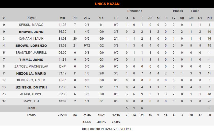 Για την Ούνικς, Λορένζο Μπράουν και Αϊζάια Κάνααν ήταν οι κορυφαίοι για την ομάδα του Περάσοβιτς, τελειώνοντας με 21 και 20 πόντους αντίστοιχα, αλλά ο Μάριο Χεζόνια δεν μπόρεσε να τους «μιμηθεί», με τον Κροάτη να έχει μεν 11 πόντους, αλλά ήταν αρκετά άστοχος με 3/14 σουτ εντός παιδιάς.